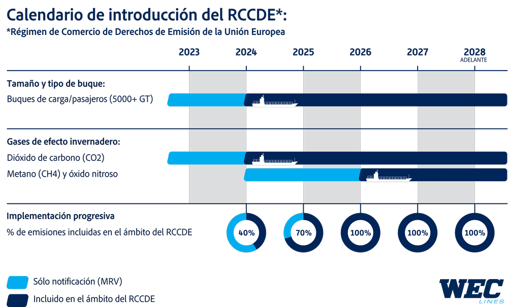 La inclusión de la industria naval en este régimen se escalonará a lo largo de tres años de la siguiente manera: 40% de cobertura a partir del 1 de enero de 2024, 70% a partir del 1 de enero de 2025 y 100% a partir del 1 de enero de 2026. Esta directiva se aplicará a los buques de arqueo bruto igual o superior a 5.000 toneladas (2024 para los de carga/pasajeros, 2027 para los de alta mar).