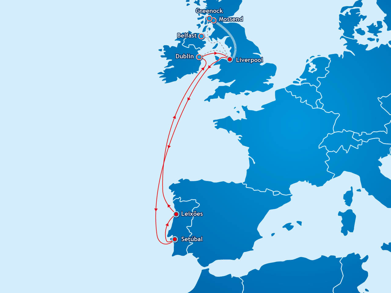 - Servicio UK/IE – Portugal: Setúbal – Leixões – Dublín – Liverpool – Setúbal