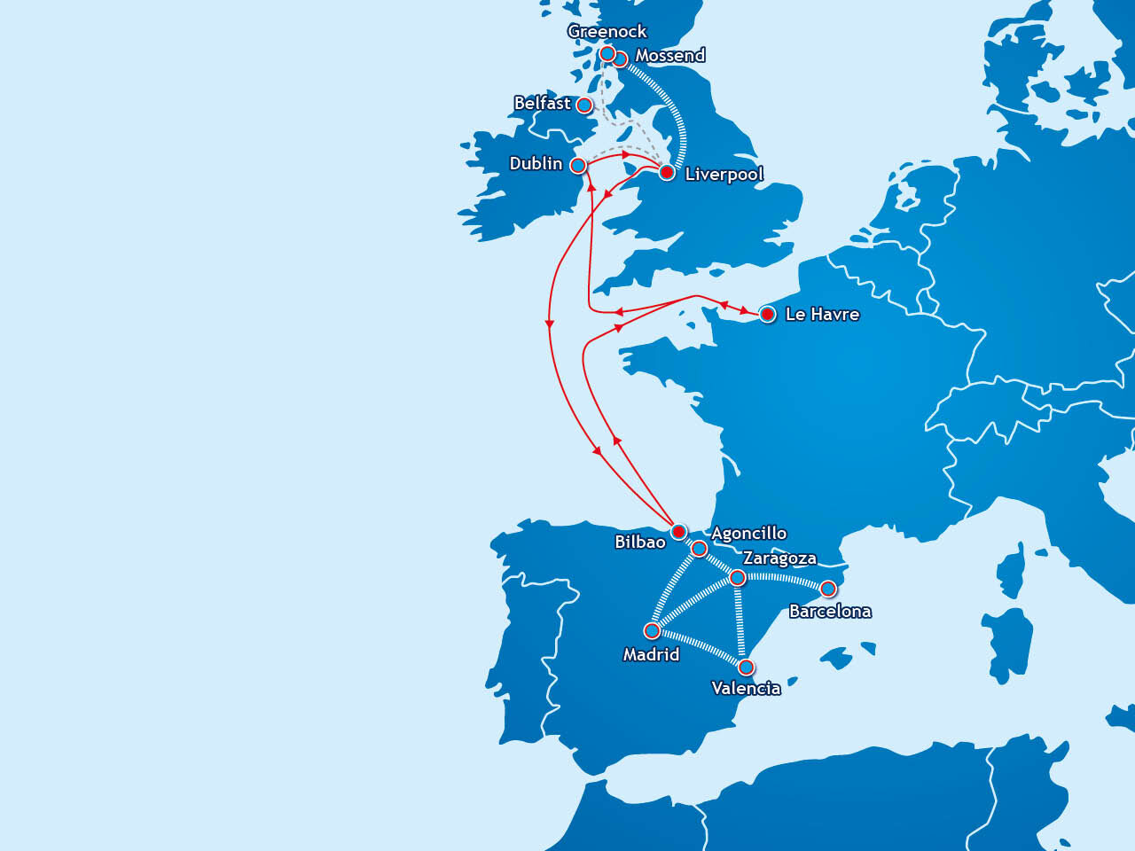 - Servicio UK/IE – España: Bilbao – Le Havre – Dublín – Liverpool – Bilbao