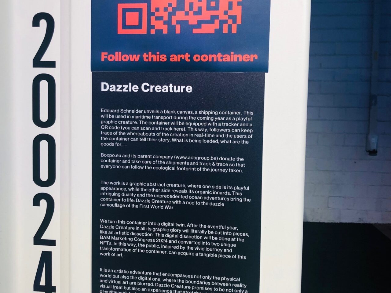 La intención de este proyecto único es hacer visible la logística a personas ajenas a nuestro sector y acercar a los seguidores del contenedor a nuestra industria. A finales de 2024, la Criatura Deslumbrante será diseccionada en piezas que se venderán en subasta. Una persona tendrá la obra de arte completa (digitalmente) y, además, particulares y empresas podrán adquirir un pequeño trozo de la Dazzle Creature en la vida real.