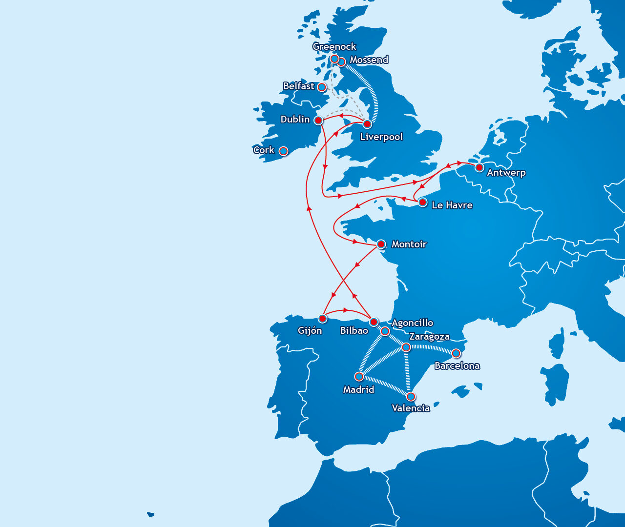 • Puertos clave: Bilbao, Le Havre, Antwerp, Montoir, Gijón, Dublín y Liverpool