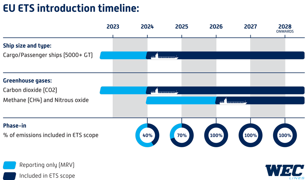 The inclusion of the shipping industry in this scheme will be phased in over three years as follows: 40% coverage as of January 1st, 2024, 70% as of January 1st, 2025, and 100% as of January 1st, 2026. This directive will be applicable to ships with a gross tonnage of 5,000 and above (2024 for cargo/passenger, 2027 for offshore).