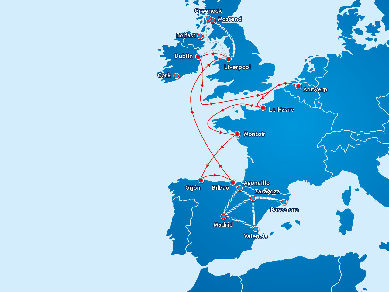 In addition, short transit times ex Antwerp and Montoir-de-Bretagne to Bilbao are offered – 7 days and 2 days respectively – facilitating seamless onward rail connections to Barcelona, Valencia, Madrid, Zaragoza, and Agoncillo (La Rioja). From Liverpool fast rail connections are offered into Belfast, Mossend, and Greenock.
